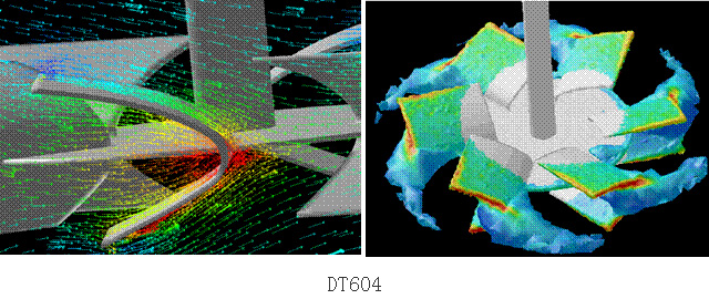底層六箭葉圓盤渦輪改為DT604六凹葉圓盤渦輪,可防止通氣后功率的下降,從而提高氣體的分散能力和大氣量的處理能力,并可減小對氣量的要求。DT604六凹葉圓盤渦輪徑向流槳,其葉片型式為最優(yōu)化設(shè)計的非對稱拋物面,與傳統(tǒng)的六半管葉片圓盤渦輪相比,不僅可以節(jié)能30%以上,而且還可以分散更多的氣體,并且不會產(chǎn)生大的壓降,通氣率對攪拌功率的下降影響較小。