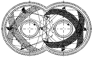 WZS型自清潔脫揮器為連續(xù)式操作,其由一個水平殼體和兩個水平軸組成。在8字形截面的殼體內(nèi),兩攪拌軸相互嚙合,雙軸同向旋轉(zhuǎn),同步轉(zhuǎn)速比為 xx:xx,分別為xx rpm(主軸)和xx rpm(清潔軸)兩個轉(zhuǎn)速(見圖1)。雙軸旋轉(zhuǎn)過程中所產(chǎn)生的動態(tài)輪廓線確保了設(shè)備中無死角,即自清潔作用(見圖2)。為了在提供強力混合的同時又推動物料(包括高粘度物料)逐漸前移,攪拌槳和U形捏合桿按螺旋狀排列,這種排列方式為高粘度的物料的軸向前移提供了推動力,而且能阻止物料的反向流動,使物料在設(shè)備中的流動接近平推流,從而提高了物料的脫揮效果。