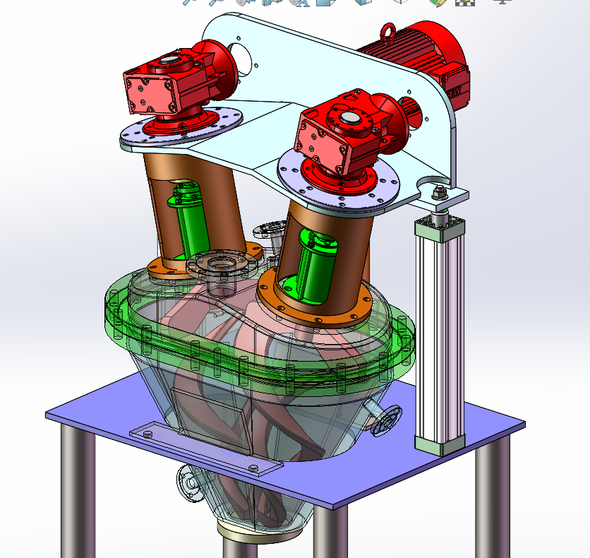 該雙錐體無軸螺帶混合裝置,考慮到了不同的化工原料會有異味、毒性、刺激等情況,設計成密閉工作空間,設有真空口、充氣口等對反應壓力調節,以及對異味等進行抽排處理,從而保證環保要求和安全需要。