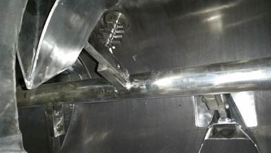 LDH-犁刀混合機,由主動輪減速機帶動犁刀組軸運動,一方面將物料沿筒體圓周作徑向周向湍動,同時將物料沿犁刀兩側的法線方向拋出,另一方面被拋出物料經飛刀組時,被高速旋轉的飛刀剪切攪拌而強烈的拋散,物料在犁刀和飛刀的復合作用下,不斷更疊、擴散,物料在不斷被翻動的同時又互相摻和,因此在極短的時間內達到均勻的混合。塊狀固—固(粉體與粉體)、固—漿(粉體與膠漿液)的物料或密度差異較大的物料也能混合。