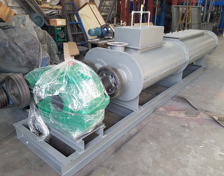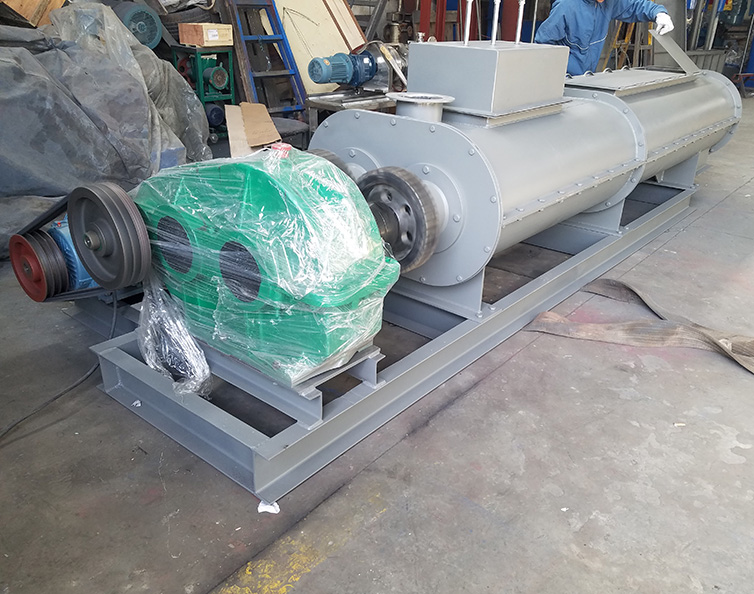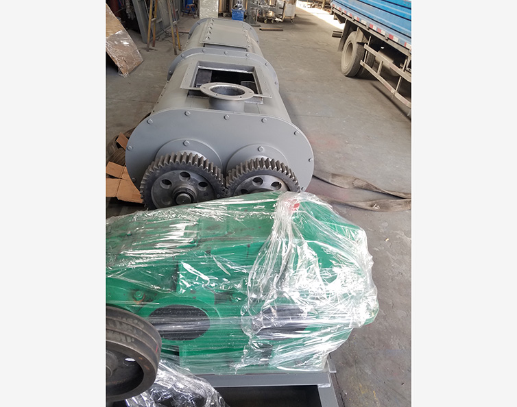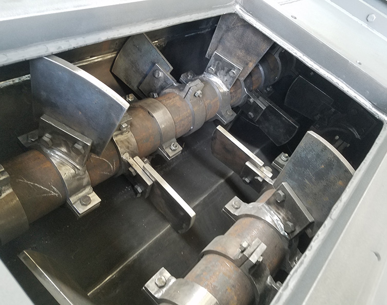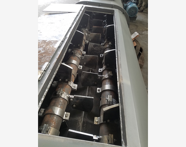 臥式雙軸混合機(jī)由臥式W形容器、帶(或者不帶)開(kāi)口的頂蓋、安裝有槳葉并反向旋轉(zhuǎn)的雙軸、傳動(dòng)單元、支撐架、密封件、出料結(jié)構(gòu)等部件組成。由于雙軸反向旋轉(zhuǎn),成一定角度的漿葉將物料沿軸向、徑向循環(huán)翻攪,使物料達(dá)到均勻混合的效果。物料在混合器內(nèi)的上拋運(yùn)動(dòng)形成流動(dòng)層,產(chǎn)生瞬間失重。從而達(dá)到剪切、混合的效果。