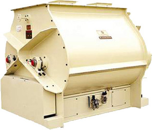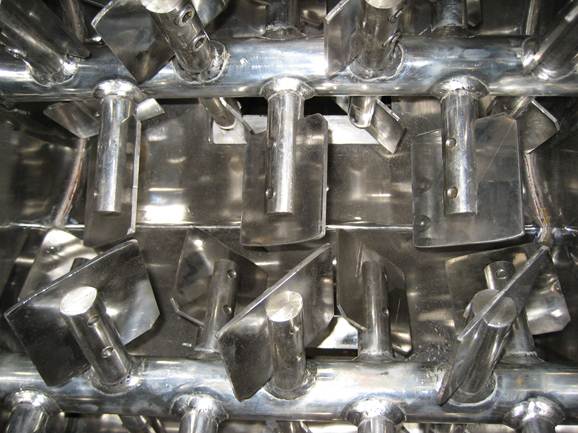 該機在w形的混合室內裝有一對以相反方向旋轉的軸,在每個軸上安裝具有一定角度、一定數量且呈重疊狀的槳葉,在具有一定圓周速度的混合室內形成流動層,層內的物料在對流混合原理的作用下進行混合,并在瞬間處于失重狀態,因而得到均勻混合物。 在容器上方亦可裝有噴液口,進行噴加液體的固-液混合。