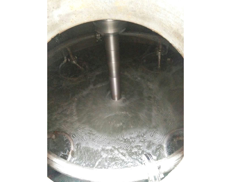 5. 利用下層寬葉仿曲面軸流推進槳大排量的循環,將剛剛噴射出來的氣體,牢牢的壓制在釜體底部,同時也將釜底催化劑固相物料楊起,達到完全懸浮的狀態;