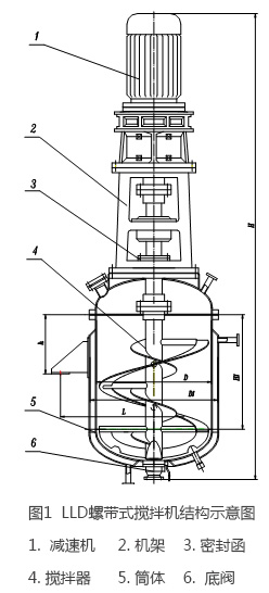 LLD系列螺帶式攪拌機(jī)結(jié)構(gòu)如圖1所示,主要由擺線減速機(jī)、機(jī)架、密封函、攪拌器、筒體、底閥等組成。