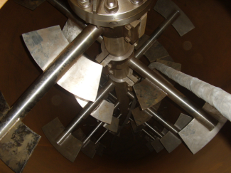 該機(jī)由擺線減速機(jī)直接驅(qū)動(dòng)攪拌軸旋轉(zhuǎn)。攪拌軸由與筒體吻合的螺帶及實(shí)心螺旋組成,旋轉(zhuǎn)時(shí),螺帶將物料由下向上沿反應(yīng)釜筒體內(nèi)壁盤旋提升。運(yùn)轉(zhuǎn)時(shí)物料在其作用下產(chǎn)生了不規(guī)則的對(duì)流、剪切、摻混、擴(kuò)散等,形成全方位的三維運(yùn)動(dòng)。攪拌軸的中心是一實(shí)心面體螺旋,在運(yùn)轉(zhuǎn)時(shí)將靠中心的物料下壓,形成物料的大循環(huán)。如此不斷反復(fù),使物料在短時(shí)間內(nèi)達(dá)到均勻混合。