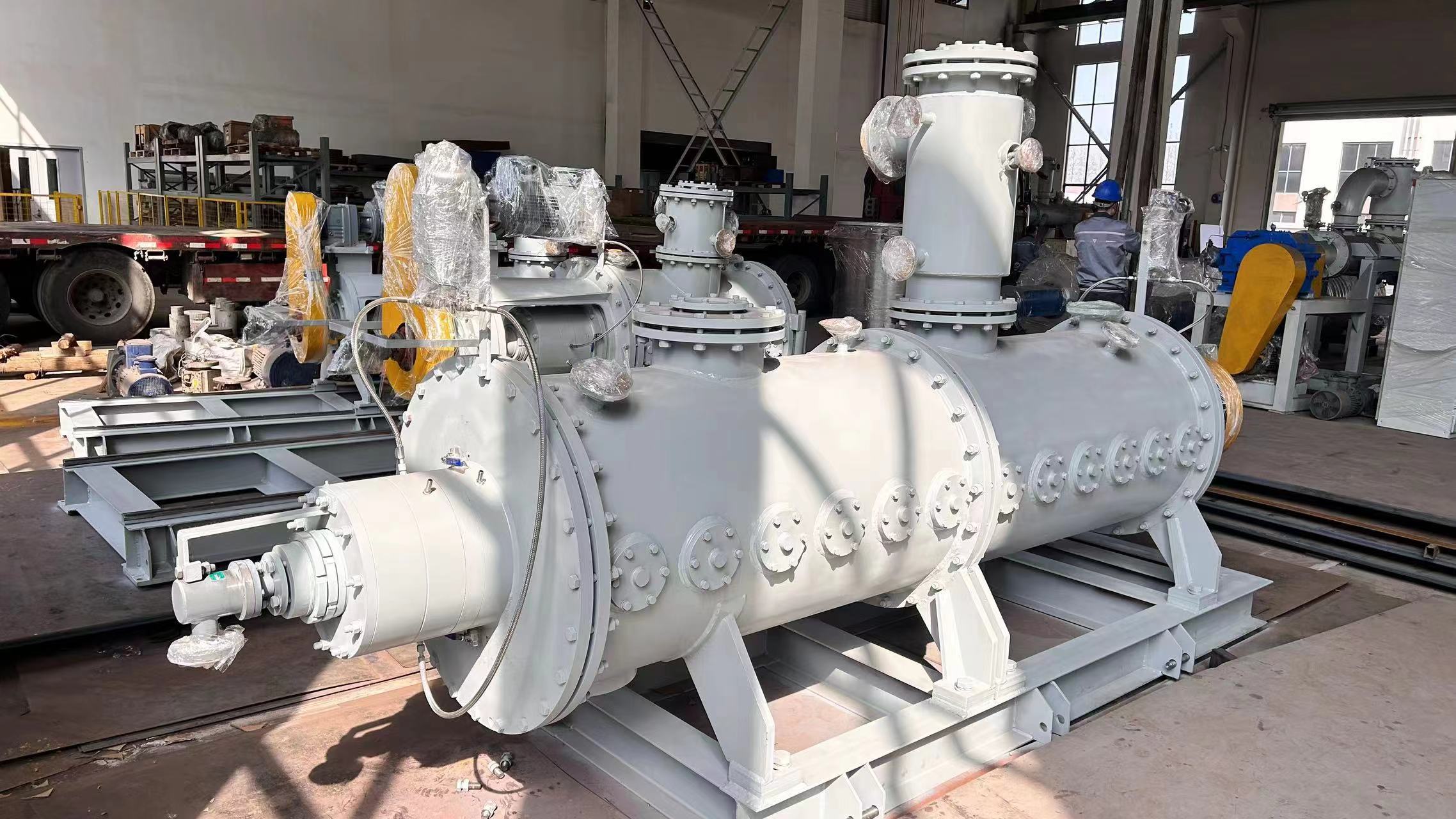 .混合機除夾套有傳熱功能外所有部件均可被用來進行熱傳遞,其主要的傳熱單元還是攪拌軸和攪拌盤,攪拌軸和槳盤中間設計是空心的,為了盡量增大單位設備容積的傳熱面積,攪拌軸和攪拌槳都能通入0-300℃傳熱介質循環,加上強勁的混合和捏合作用能有效地使物料更快地表面更新,該作用與具有自清潔功能的傳熱面相結合,從而確保熱、質傳遞所需的高表面更新速率。單位時間內物料接觸換熱面積增加,使該混合設備具有高效的傳熱能力.是高粘流體物料反應,脫泡,蒸發,干燥,脫輝的首選裝置。
