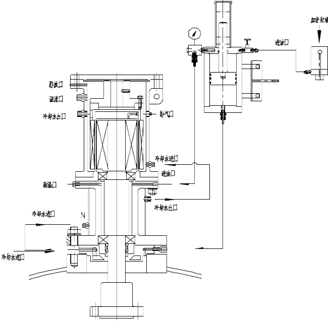 1、在密封隔離套內(nèi)的軸承下端設(shè)置一套專有技術(shù)的機(jī)械密封系統(tǒng),將軸承完全密封在稀油潤滑油腔中,外接特制的壓力平衡、補(bǔ)油系統(tǒng)。