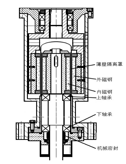 結(jié)構(gòu)組成:有聯(lián)軸器、機(jī)架、外磁鋼、內(nèi)磁鋼、隔離套、軸承、機(jī)械密封(封閉潤滑油腔)、攪拌軸。