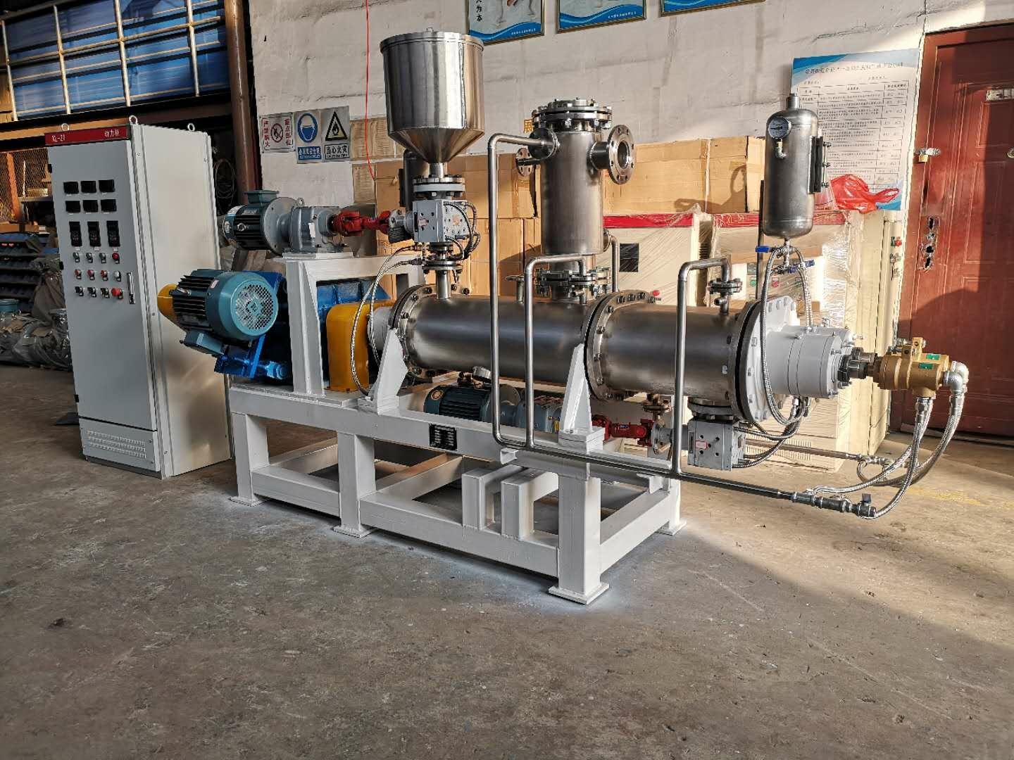 為了適應在真空狀態下的操作,專門安裝了適用于高粘度物料的齒輪泵式出料器。該出料器直接安裝在主設備上,消除了設備內的死角。齒輪泵式出料器在稍微超負荷的條件下工作,以保證物料能連續地排出,并輸入下一工段進行包裝。