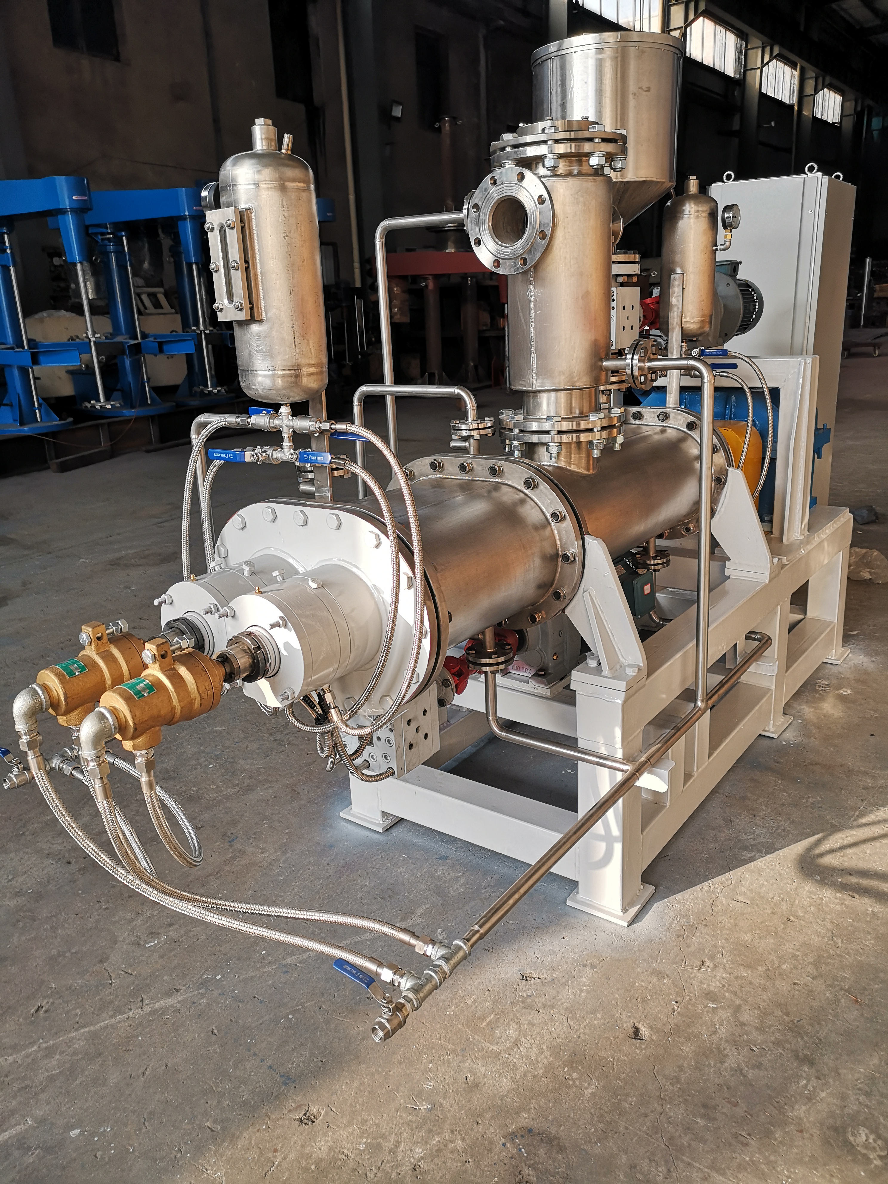 為了盡量增大單位設備容積的傳熱面積,WZS型自清潔脫揮器的殼體、攪拌軸和攪拌槳都通有導熱介質。強力的混合和捏合作用能有效地使物料更快地表面更新,該作用與具有自清潔功能的傳熱面相結合,從而確保熱、質傳遞所需的高表面更新速率。