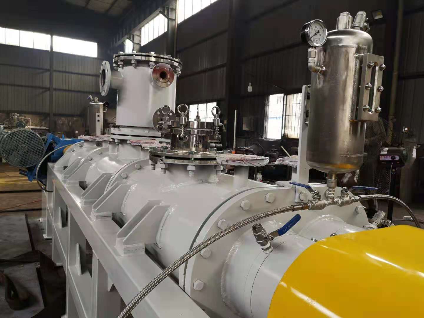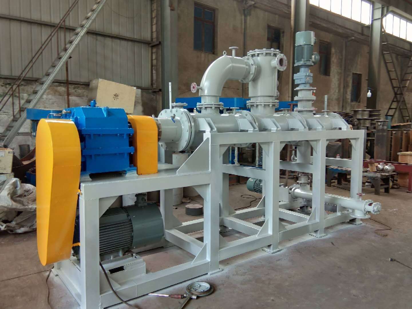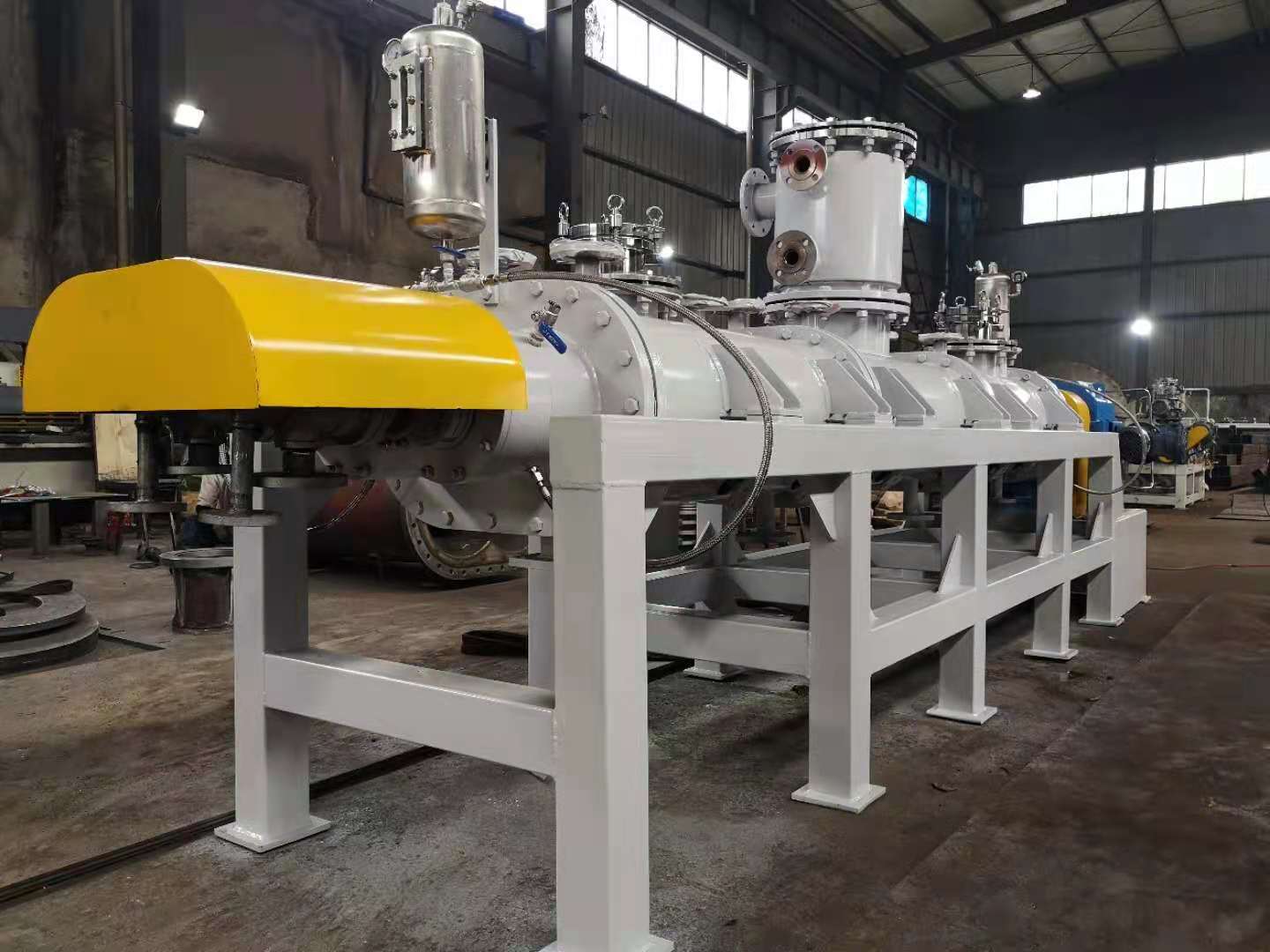 .混合機(jī)除夾套有傳熱功能,其主要的傳熱單元還是攪拌軸和攪拌盤(pán),攪拌軸和槳盤(pán)中間設(shè)計(jì)是空心的,能通入0-300℃?zhèn)鳠峤橘|(zhì)循環(huán),加上攪拌軸的旋轉(zhuǎn),單位時(shí)間內(nèi)物料接觸換熱面積增加,使該混合設(shè)備具有高效的傳熱能力.是高粘流體物料反應(yīng),蒸發(fā),干燥,脫輝的首選裝置。