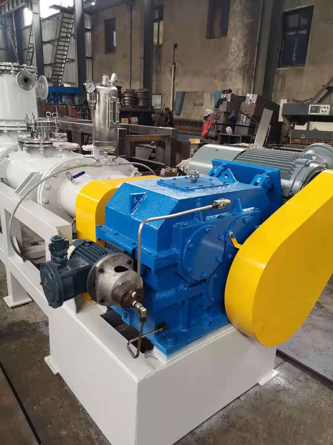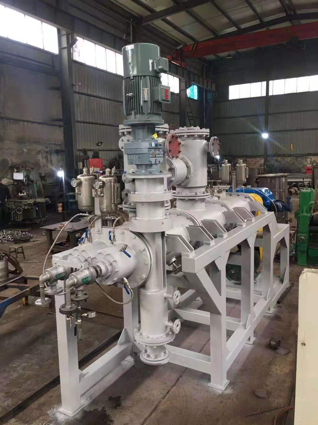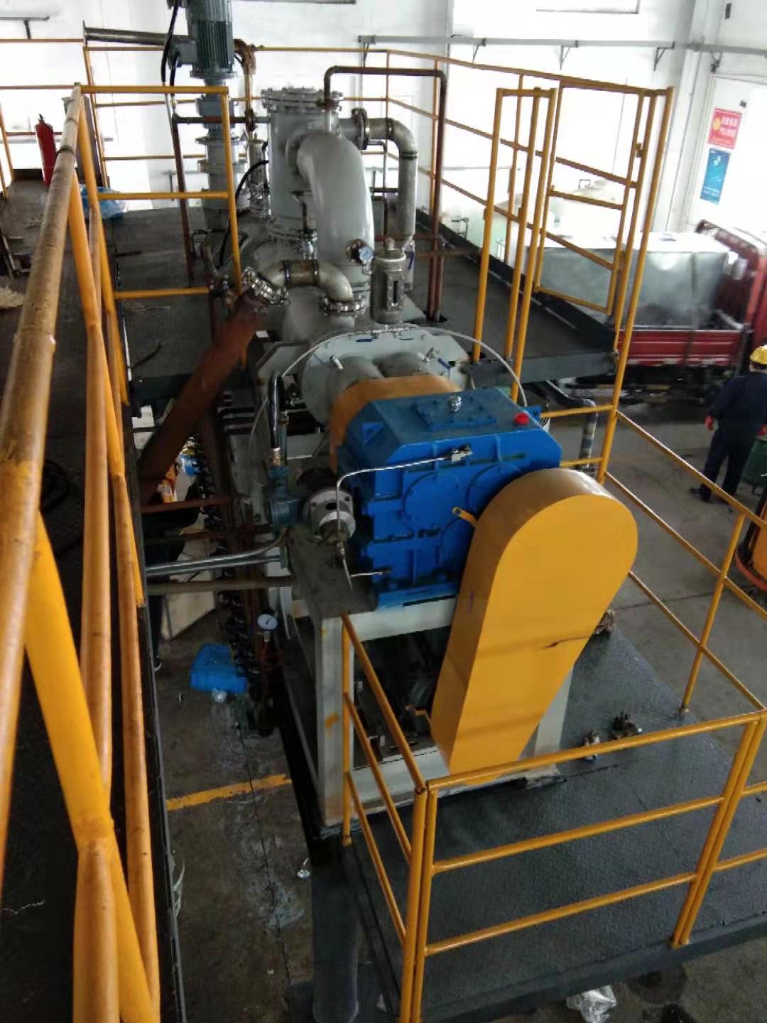 為了適應(yīng)在真空狀態(tài)下的操作,專(zhuān)門(mén)安裝了適用于高粘度物料的齒輪泵式出料器。該出料器直接安裝在主設(shè)備上,消除了設(shè)備內(nèi)的死角。齒輪泵式出料器在稍微超負(fù)荷的條件下工作,以保證物料能連續(xù)地排出,并輸入下一工段進(jìn)行包裝。