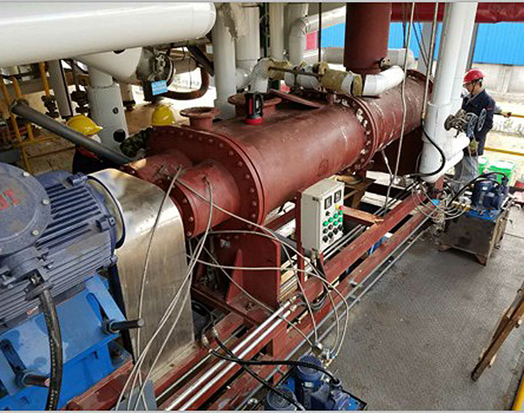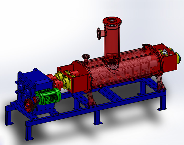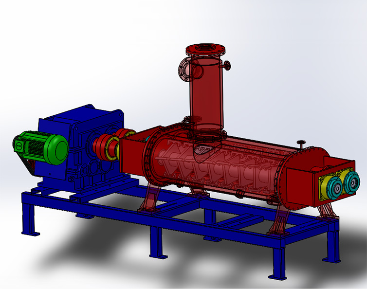 為了盡量增大單位設(shè)備容積的傳熱面積,WZS型自清潔脫揮器的殼體、攪拌軸和攪拌槳都通有導(dǎo)熱介質(zhì)。強(qiáng)力的混合和捏合作用能有效地使物料更快地表面更新,該作用與具有自清潔功能的傳熱面相結(jié)合,從而確保熱、質(zhì)傳遞所需的高表面更新速率。