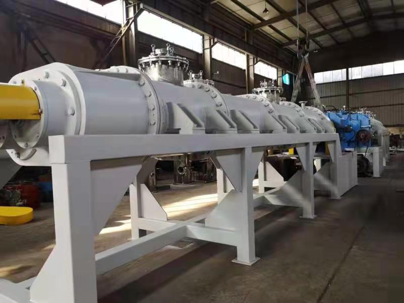.混合機(jī)除夾套有傳熱功能,其主要的傳熱單元還是攪拌軸和攪拌盤,攪拌軸和槳盤中間設(shè)計是空心的,能通入0-300℃?zhèn)鳠峤橘|(zhì)循環(huán),加上攪拌軸的旋轉(zhuǎn),單位時間內(nèi)物料接觸換熱面積增加,使該混合設(shè)備具有高效的傳熱能力.是高粘流體物料反應(yīng),蒸發(fā),干燥,脫輝的首選裝置。