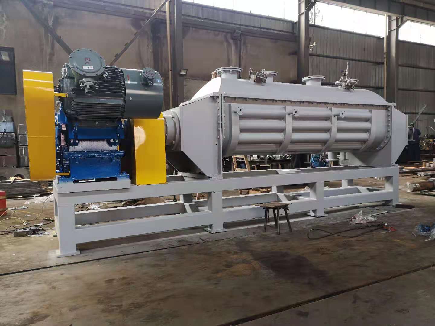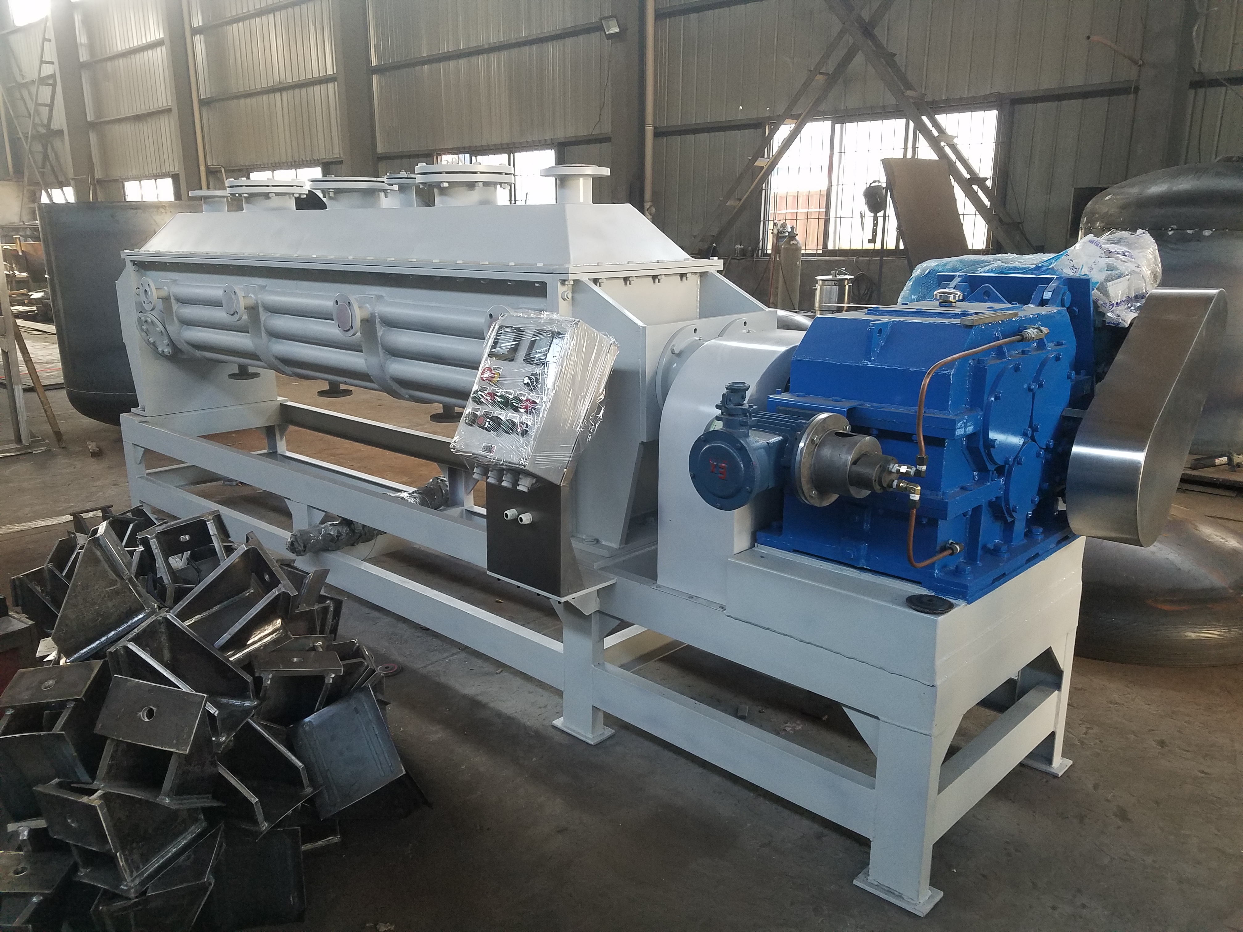 .混合機除夾套有傳熱功能,其主要的傳熱單元還是攪拌軸和攪拌盤,攪拌軸和槳盤中間設計是空心的,能通入0-300℃傳熱介質循環,加上攪拌軸的旋轉,單位時間內物料接觸換熱面積增加,使該混合設備具有高效的傳熱能力.是高粘流體物料反應,蒸發,干燥,脫輝的首選裝置。